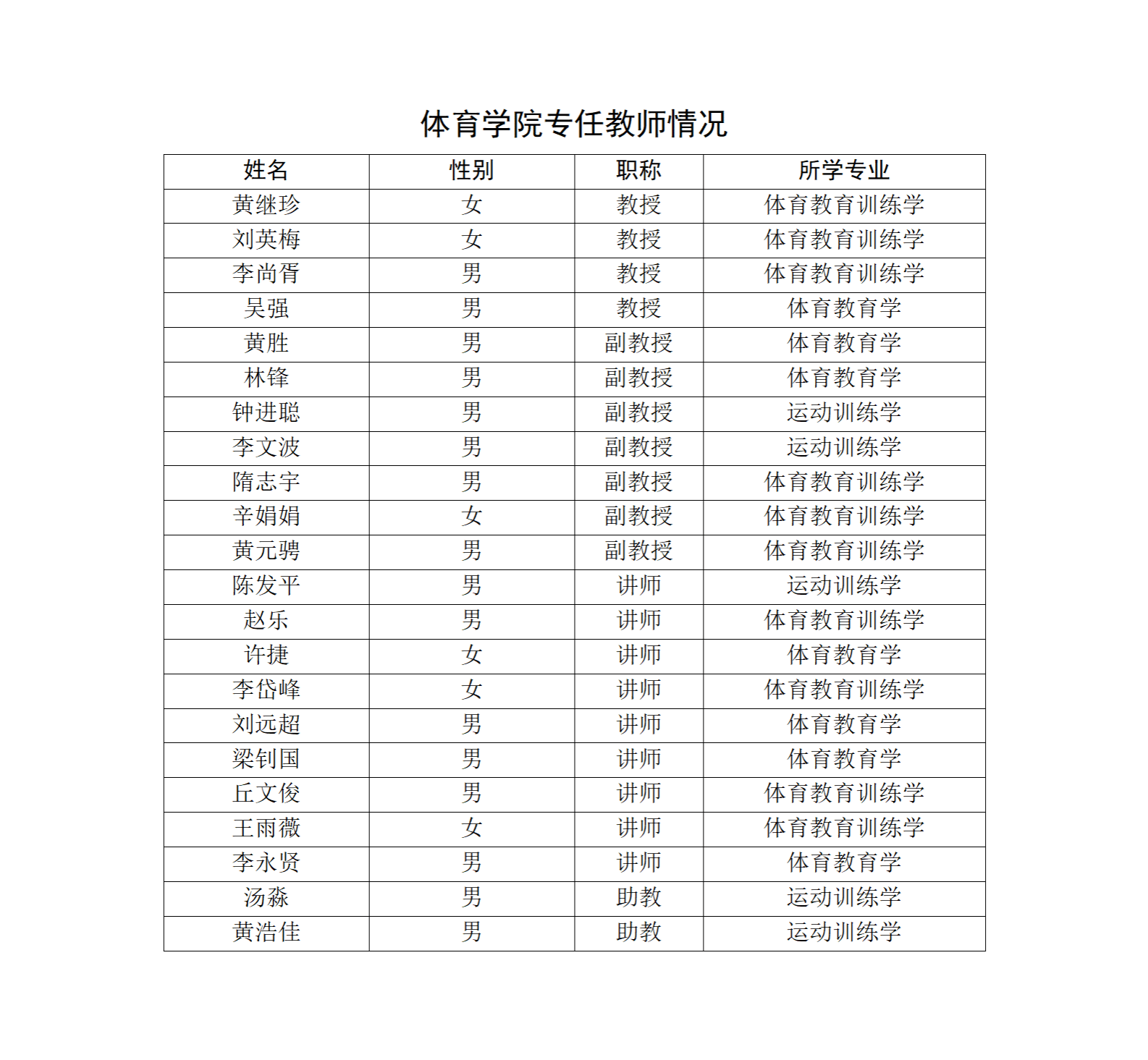 体育学院现有教职工28人,专任教师22人中,教授4人,占18.18%,副教授7人,占31.82%;具有博士学位的教师1人,具有硕士以上学位的教师18人。学院教师均毕业于北京体育大学、华南师范大学、广州体育学院、沈阳体育学院、吉林师范大学、广西师范大学、华东师范大学、中山大学、暨南大学等省内外高校。目前,体育学院45岁以下专任教师14人,占师资总数的63.64%。老、中、青教师比例合理且基本保持稳定,教师队伍整体呈合理发展趋势。中青年教师已构成教师队伍的主体,成为教学、科研、训练的骨干力量。学院师资队伍数量、学科、职称、年龄结构合理,学历层次不断提高,学缘结构趋于合理,目前已基本形成了以高职称、高学历教师为骨干,以中、青年教师为主体,在教学、科研、训练等方面有机联系、相互促进的师资队伍。